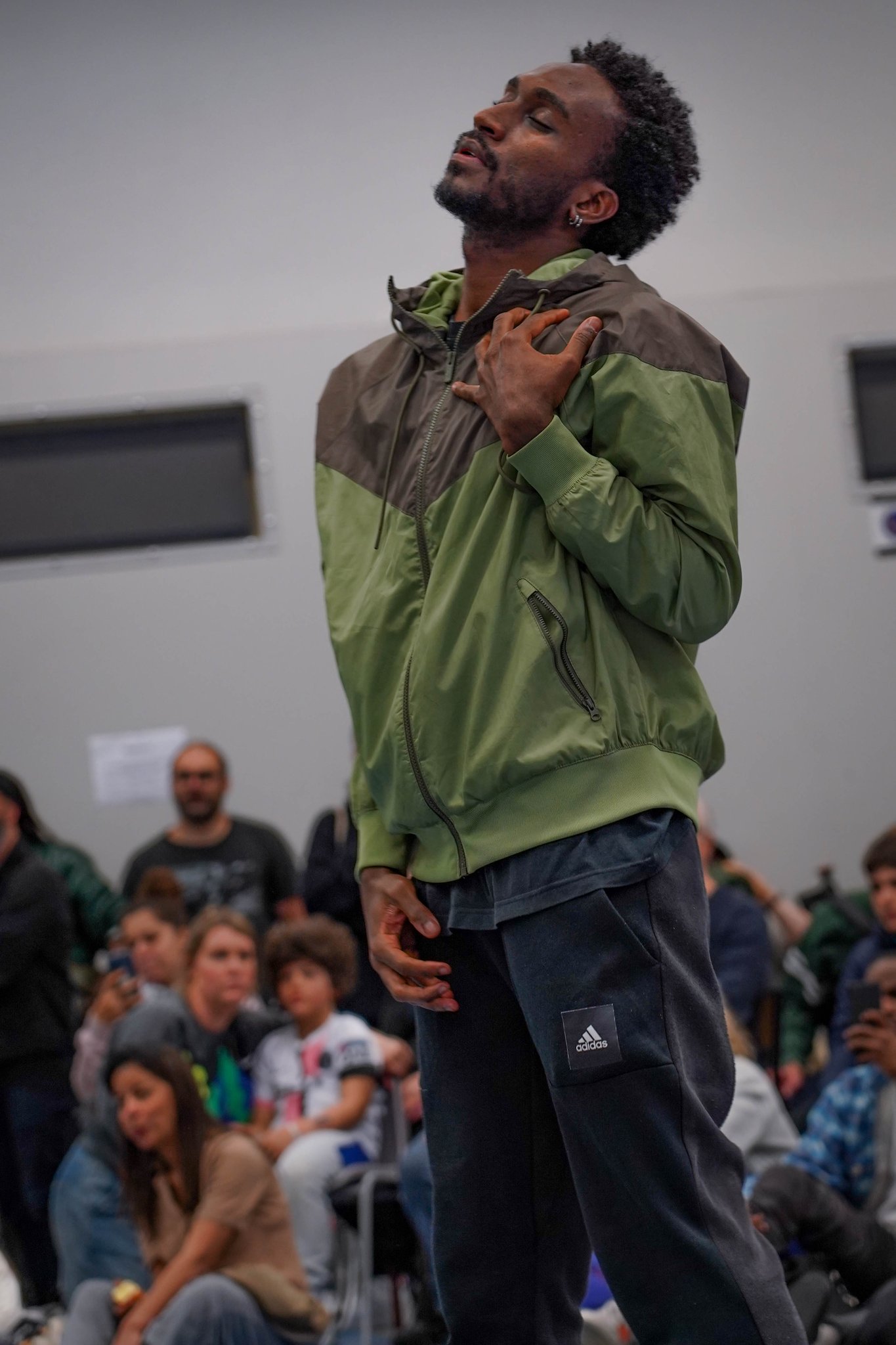 Cette pièce est un dialogue s’appuyant sur la technique corporelle du popping mais aussi sur la musique, les costumes et sur l’interprétation.